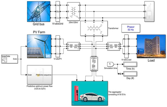 As mentioned before, the primary objective of prediction of renewable energy sources for near future is to determine how much power can be utilized from the controllable resources such as stationary energy storage systems or electric vehicles to stabilize the power system. As a consequence, an energy management system can attain the optimum solution for each time sequence in advance, reducing computational efforts. In this regard, the introduced predictor evaluated previously is implemented in the Matlab Simulink simulation platform. In the second step, the predictor model is connected to the grid architecture, as depicted in Figure 7. The OPF problem of the nano-grid has six decision variables; three of them represent the active power schedule of V2G, G2V, and grid bus, and two decision variables are allocated to the voltages of the grid and the aggregation of EVs. After, the controllable resources can be adjusted to the new operating conditions to reach the Pareto front for each sequence. In this step the OPF algorithm is known as the centralized controller. Indeed, the OPF is employed to predict how much power should be injected or drawn from the aggregator. Then the decentralized controller individually decides whether the EV should contribute to V2G, G2V, or standby phase based on its SoC and capacity.