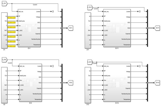 Figure 8 shows four EVs, controlled individually by a decentralized controller. This infrastructure enables engineers or designers to evaluate the effect of various EVs with different battery characteristics on the grid architecture, as the initial SoC, the initial number of cycle, initial capacity, and ambient temperature can be adjusted in this model. The output of the model is voltage, SoC, RCD, capacity, number of cycles, and battery pack temperature, which can provide the users or decentralized controller with valuable information as decision variables. Details on the degradation mechanism and semi-empirical aging model can be found in reference [32].