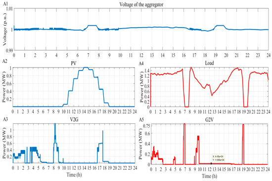 Time-based active power and voltage profile through the architecture (Scenario A): (A1) voltage profile of the aggregator, (A2) generated active power from PV, (A3) injected active power from the aggregator (V2G), (A4) Demand side, (A5) the drawn active power from the architecture to the aggregator (G2V).