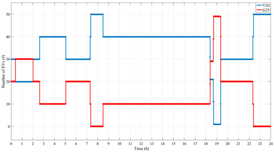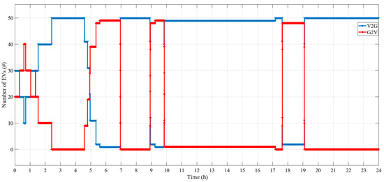 As can be seen in Figure 12, the EVs are being discharged to decrease power losses as the active load is 1.282 MW. Thereafter, the optimized control variables are forwarded to the decentralized control to transit the standby EVs to V2G phase to avoid a drop in voltage of the bus beyond the defined range. In this regard, the voltage drops from 1 to 0.999 p.u. at 04:00–06:30. Nevertheless, the minimum voltage limitation is not violated. The reason is to predict the load and the PV production; consequently, optimize charge and discharge rats. As soon as the load decreases to its minimum, the voltage of the bus increases to 1.002 from 0.999 p.u. during 06:30–07:00, and the states of the EVs are changed from standby to G2V phase as the demand increases to the maximum value at the time of 08:00, which can be seen in Figure 13. As the load increases to the maximum value and the voltage decreases, EVs as controllable energy sources are discharged to keep the voltage of the aggregator within the allowable boundaries. Since the demand decreases to its minimum from 19:00 to 20:00 and this information was provided by first layer of controller to the second layer, all EVs were charged as the total injected power from system to the aggregator is 1 MW during the time. As can be inferred from Figure 9 and Figure 12, the bi-directional power flow decreases substantially due to having information on the state of the system in advance.