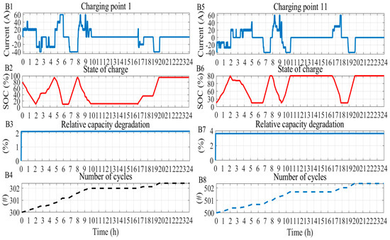 Comparison of the 1st and 11st EVs with different initial SoCs and cycles: (B1) current profile of EV1, defined by the decentralized controller, (B2) time-based SoC of EV1, (B3) rate of capacity degradation of EV1, (B4) number of cycles of EV1, (B5) current profile of EV11, defined by the decentralized controller, (B6) time-based SoC of EV11, (B7) rate of capacity degradation of EV11, and (B8) number of cycles of EV11.