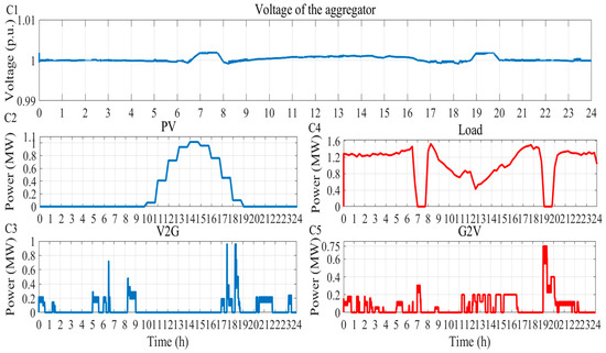 Time-based active power and voltage profile through the architecture (Scenario B): (C1) voltage profile of the aggregator, (C2) generated active power from PV, (C3) injected active power from the aggregator (V2G), (C4) Demand side, (C5) the drawn active power from the architecture to the aggregator (G2V).