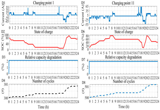 Comparison of the 1st and 11st EVs with different initial SoCs and cycles: (D1) current profile of EV1, defined by the decentralized controller, (D2) time-based SoC of EV1, (D3) rate of capacity degradation of EV1, (D4) number of cycles of EV1, (D5) current profile of EV11, defined by the decentralized controller, (D6) time-based SoC of EV11, (D7) rate of capacity degradation of EV11, (D8) number of cycles of EV11.