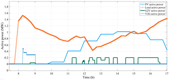 Figure 15 shows the active power of the grid, consumption, PV, G2V, and V2G of the scenario B. For better visibility, Figure 15 is a close up of parts of Figure 12. As can be inferred from Figure 15, by increasing active power demand, electric vehicles contribute to V2G phase, resulting the power reduction from grid to the load. Then, as soon as the PV production is injected to the system, electric vehicles are transited to G2V phases according to their SoC.
