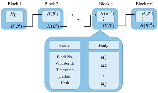 The general data structure in blockchain shown in Figure 1 is mainly divided into two parts of block header and block body. Block n and block n + 1 is linked by its cryptographic hashes . The block header is formed with a block number, a validator ID to test the results of a verification, the timestamp, and a concise cryptographic hashes H(B) to connect the precious block. The block body is constitutive of the main valid transaction information Mi of this block which indicate the system states, including control status, trading information, and so on.