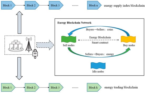 According to above description of the blockchain analysis, this article puts forward an energy blockchain network model shown in Figure 2. The main relevant terms in the model of energy blockchain network are listed clearly in Table 1. Figure 2 shows main components in energy blockchain network (EBN): Nodes, energy supply index blockchain (ESIB), energy trading blockchain (ETB), and smart contract (SC). There are three types of energy nodes: Energy sellers, energy buyers, and energy idle nodes. They play a variety of roles in energy trading, according to their energy demands and states.