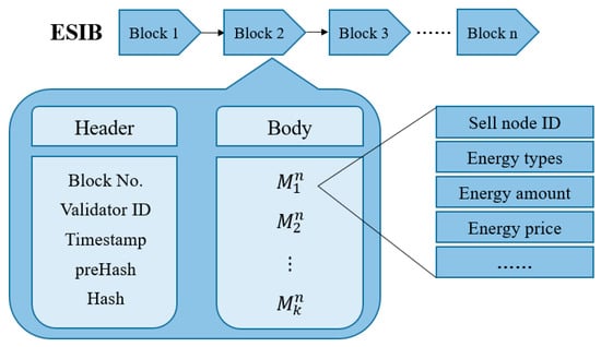 The data structure of ESIB can be described as shown in Figure 3 [31]. Energy sell nodes submit information about themselves such as node ID, energy types, and energy price to EBN to form blocks of ESIB, and energy buy nodes search the most matched seller according to information of the latest ESIB blocks. Once the trade between buyers and sellers is formed, trade information will be sent to the EBN to aggregate into a block and converge to ETB. The main difference between the data structure of ETB and ESIB is the main information in the block body, which is represented in Table 2.