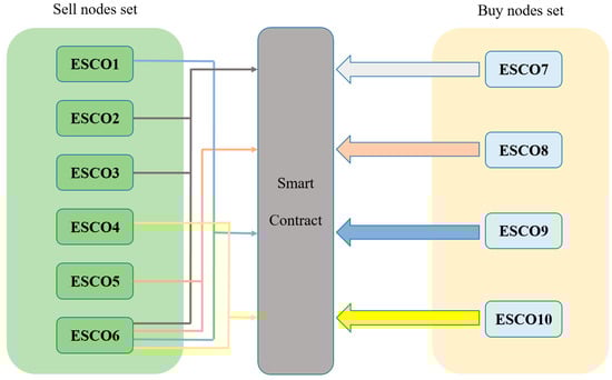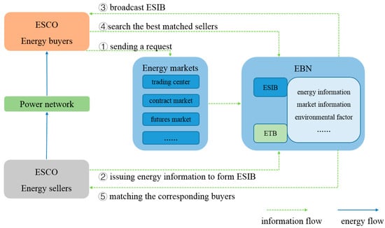 The operational process of individual ESCO model based on EBN (EBN-IESCOM) is shown in Figure 4. The detailed procedures are as follows: Firstly, the energy buyers participating in the system will submit their own information of energy demands to the market. Then, the energy sellers participating in the system submit their own information of energy supply to EBN to form ESIB, and the EBN broadcasts the ESIB to ensure energy buyers can search the best sellers to match their demands. During the matching process, smart contracts play an important role depending on different situations. Once the energy match is successful, both trade counterparties complete an energy deal according to the content of smart contracts.
