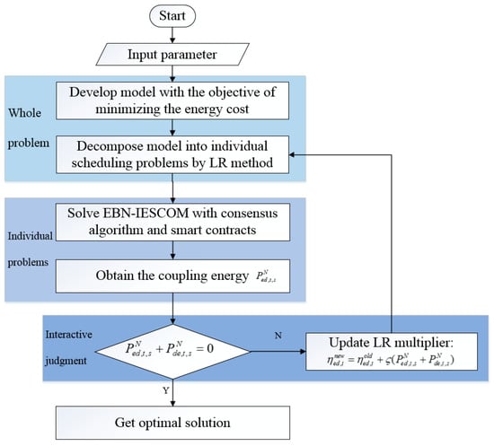 In summary, the objective function for ESCOs is to realize the minimization of the energy cost in the energy scheduling. Decomposing the whole problem with hard constraints into a series of smaller and individual scheduling problems is executed with a Lagrangian multiplier centrally. As for the smaller and individual scheduling problems, they are solved in a decentralized mode, by smart contracts with consensus algorithm based on EBN. The solutions are checked by the coupling energy relationship among ESCOs and updated through a LR multiplier. Combining Lagrange relaxation decomposition technology and smart contracts with consensus algorithm effectively, the optimal solution will be obtained finally. The specific flowchart of the proposed method can be described as follows (Figure 6).