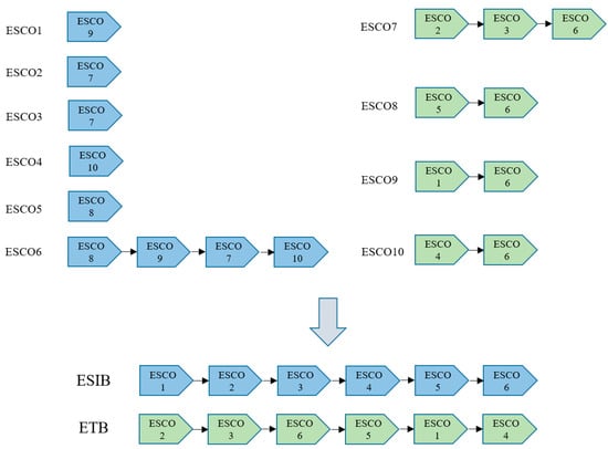- ESCO9 with commercial energy demand: The stability of energy demand is in middle level, lead to ESCO9 having many choices. Due to the large demand of the commercial energy, the limited capacity of one ESCO cannot meet the requirements. The shortage departments are supplied by other ESCOs. Therefore, the demand of the commercial energy can be supplied by ESCO1, ESCO5, and ESCO6, and finally the ETB of ESCO9 is ESCO1 and ESCO6. The energy amount of ESCO1 and ESCO6 is 60 MW and 840 MW, respectively.