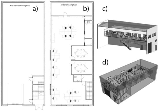 The base of the first building is of rectangular shape with an area of 218.14 m2 (see Figure 1) and its main wall faces southwest (216° N). The building is distributed on two floors (defined as ground and first), being the lower level used for storage and the upper zone for offices, meeting rooms, and kitchen, among others uses. This building is the headquarters of a private company specialized in air-conditioning systems. The working hours, considered from Monday to Friday throughout the year, are from 08:30 a.m. to 06:00 p.m.
