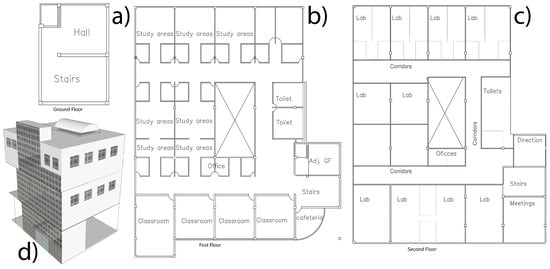 For the second case, the plant of the building has an “L” shape, covering an area of 1214 m2 in each of its three heights that we define as: ground floor (GF), first floor (FF) and second floor (SF). The GF corresponds to a parking lot without vertical enclosures and a reception area, while the other two floors are classrooms, meeting rooms, laboratories, offices, etc. as is shown in Figure 2. The building hosts a research center on physics and mathematics (CICFIM), which is located behind of the School of Physics and Mathematics of the Universidad Autónoma de Nuevo León (Mexico). Its principal access is on the facade facing east, next to the campus stadium, to the west. This building starts the activities at 7:00 a.m., ending at 9:00 p.m. from Monday to Friday. Saturday’s schedule is from 10:00 a.m. to 2:00 p.m.