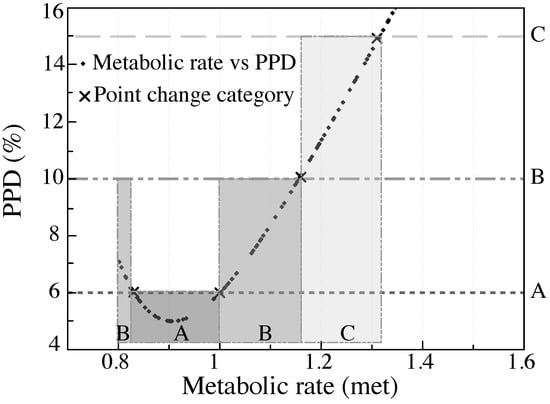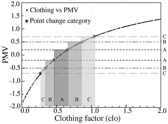 The results of the SA on the comfort index (PMV and PPD) for the clothing and metabolic rate are shown in Figure 4 and Figure 5, respectively. The thermal category changes according to PMV and PPD values, which in turn depend on the subjective decisions of clo and met. Figure 4 shows that for category A, the clo values vary from 0.46 to 0.66, for B of 0.34 to 0.46 clo and 0.66 to 0.87 clo. Category C is between 0.27 to 0.34 clo and 0.87 to 1.04 clo. For the case of met and PPD, in Figure 5 we show that category A lies between met values from 0.83 to 1.04. For the case of category B, it remains from 0.8 to 0.83 met and 1.04 to 1.16 clo. Finally, category C corresponds to the range from 1.16 to 1.31 met.