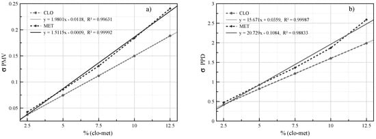 In the Figure 6a, the relationship between the widths of the distributions of clo and met and the value of σPMV is presented. For example, for a width of 5 % with respect to the central value of clo and (), a value of σPMV of 0.150 is obtained and for a width of 5 % with respect to the central value of met (), a value of σPMV of 0.184 is obtained. Therefore, the impact of the metabolic factor (met) is higher than that of the clothing factor (clo) for the PMV case.