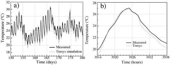 While most of the available simulators are focused on the performance of electrical and thermal networks, TRNSYS can similarly well be used to model other dynamic systems such as traffic flow, or even biological processes [,]. Studies using TRNSYS are reported in the literature as comparing cooling strategies for an office in different European climates [], thermal comfort in an indoor swimming pool [], or operating performance in cooling mode of a nearly zero energy building in China [].
