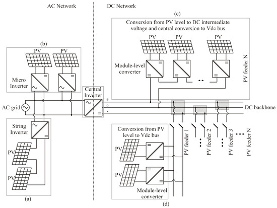 The possible electrical architectures for PV module interconnection to an AC or DC grid: (a) string inverters; (b) micro-inverters; (c) series power optimizer; and (d) parallel power optimizer.