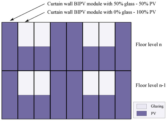 This criterion relates to the ease of the practical construction of the installation. A modular system can easily be built and is the most plug-and-play option. This modularity aspect needs an evaluation for both the mechanical and electrical installation. The main focus of this paper, however, is on its electrical aspect. Modularity in its ultimate form would mean that the mechanical and electrical installation of the building can be carried out simultaneously by the same person. This person is preferably a construction worker with a minimal amount of extra training such that no skilled electrician is required to wire up the electrical installation after the façade itself has been placed. Relating to the previous aspects of flexibility, modularity does not mean that every BIPV module will be the same. The mechanical dimensions of a curtain wall BIPV module will be the same over a certain area of the building, e.g., one floor level, for the easiness of constructing the façade. Part of the BIPV module will be glass; the other part will be PV. The ratio glass/PV is, however, a parameter that can differ over different panels. This concept is illustrated in Figure 2 where BIPV modules are shown with 50% and 100% PV penetration. Furthermore, the glazing could also be changed to transparent PV modules which further increases the variety of electrical parameters in the system.