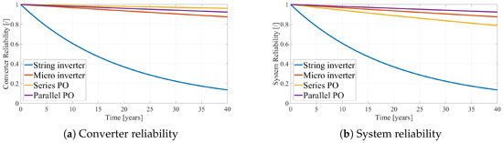 From the above numbers, the converter reliability is plotted in Figure 3a for a time span of 40 years, corresponding to the desired lifetime of a BIPV façade. The string inverter performs the worst, leading to required replacements up to five times during the lifetime of a PV installation [59,68]. The replacements are not modeled in this study. The performance of micro-inverters and power optimizers is better, leading to an estimated reliability operational at 40 years of 87% for the micro-inverter, 96% for the series power optimizer (PO), and 92% for the parallel PO. These high numbers for distributed MPPT architectures have provoked skepticism within the PV industry and are criticized, as no or little field data is available to support these claims [62]. The numbers are mainly used to show specific trends, their numerical exactness is of secondary importance. Furthermore, the numbers that are reported in literature always referring to older converter designs that were installed several years ago. They can be used to derive a correct order of magnitude, but they do not take new designs with possible different failure mechanisms into account.