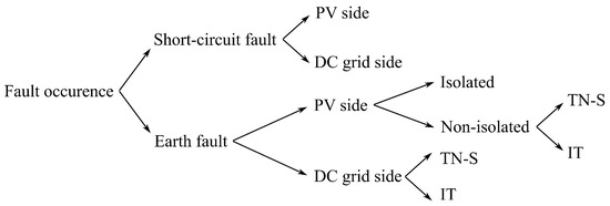 An overview of the possible faults in a fault tree structure. A distinction is made between short-circuit and earth faults and the input (PV) versus the output (DC grid) side of the converter.