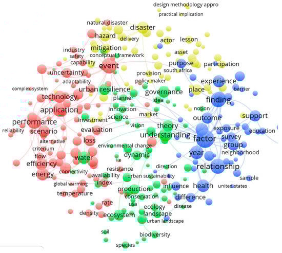 The connection between “event” under cluster 1 and “urban resilience” under cluster 3 appears to be very strong, even after pulling them away from the cores of their respective areas. This close connection might indicate the rising risk of shocks from natural disasters and the demand to find techniques with which to build robust urban resilience. “Understanding” under cluster 3 is connected to “finding” in cluster 2; the finding about the factors that determine the resilience of a system help to establish an understanding of what drives the transformation of an existing system into a more resilient one. There is almost no connection between cluster 4 and cluster 3, and “disaster”, “natural disaster”, and “hazard” are located far from “ecosystem/ecosystem service” and “green infrastructure”. This weak link could indicate a substantial gap between disaster mitigation and ecosystem service and green infrastructure development. “Understanding” (cluster 2) is situated in the center of the diagram, equally remote from both ecosystem (cluster 3) and natural disaster (cluster 4). “Understanding” also has almost no linkages to technology/application and performance/energy (cluster 1). Together, these may indicate that the current application of engineering resilience needs more scientific support, as without an in-depth understanding of the resilient factors, the performance and technical application of resilience theory cannot be improved and verified.