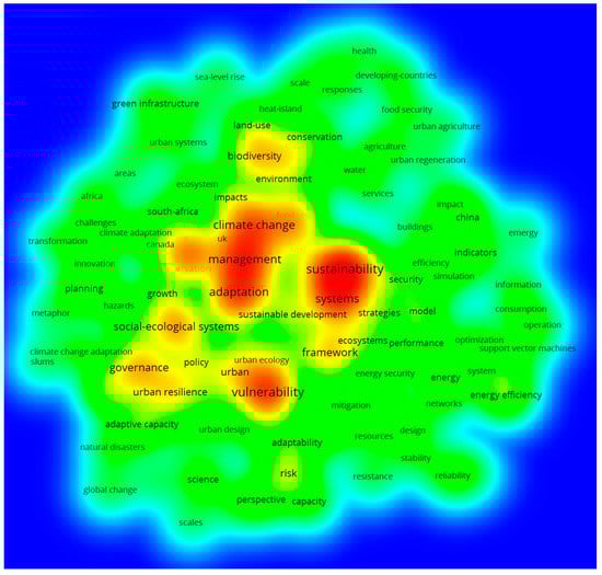 Urban resilience studies are closely related to adaptation, vulnerability, and community building, and many of the research studies are written from a social–ecological perspective. There are also quite a few technical reports produced by government and not-for-profit foundations and organizations []. This domain represents the fusion between ecology and social science. Risk management is closely related to climate change, which has the potential to bridge the gap between disaster risk reduction and climate change adaptation, as well as re-establish the connection between green infrastructure building and urban design principles. In this domain, the research related to disaster reduction has moved away from traditional disaster risk management, which mainly focuses on specific hazards such as floods and other natural disasters. Instead, it has been expanded to a wide range of disruptive events and social disturbance and stress, both stresses and shocks that could influence governance and policy making. The third domain is sustainable development, which is mainly rooted in the engineering, building, and construction fields. It does appear to have more frequent co-occurrence with other critical terms, as the concept and practice of sustainability has a much longer history in comparison to resilience; the two terms often appear as paired concepts. Through this exercise, we could observe the evolution of the concept of sustainability.