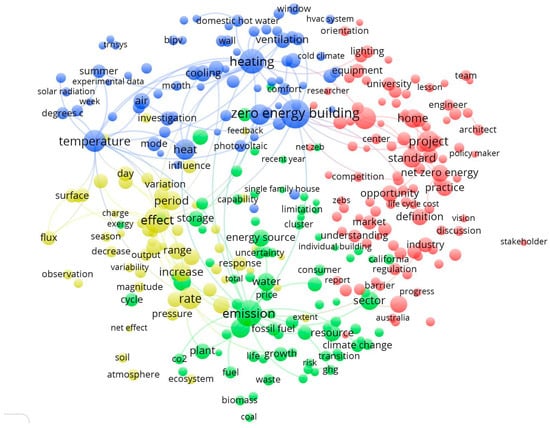 These clusters show four research areas across different disciplines related to NZE research activities, which may be referred to as net zero impact (cluster 1), net zero energy practice in industry (cluster 2), net zero emission (cluster 3), and techniques to achieve net zero energy building (cluster 4). Cluster 4 has the greatest number of research activities, which center around NZE building and temperature control. It is commonly known that NZE building mainly focuses on operating energy reduction. Heating and cooling together account for more than 50% of overall operating energy consumption, and the outside ambient temperature has a large influence on building heating and cooling loads. Those facts could explain why heating, cooling, and temperature appear as critical sub-topics in cluster 4. Cluster 2 and cluster 3 are of almost equal size, with cluster 2 containing more items and cluster 3 having items aggregating toward one major focus area, “emission.” Cluster 1 has the fewest research items and is connected to clusters 3 and 4, but has no connection to cluster 2. The disconnection between clusters 1 and 2 indicates the limited verification and measurement of the effectiveness of net zero development, particularly in the building industry. Such lack of verification and measurement caused some concerns about the validity of the NZE building design and approach, which presents a challenge and a gap as well as opportunities.