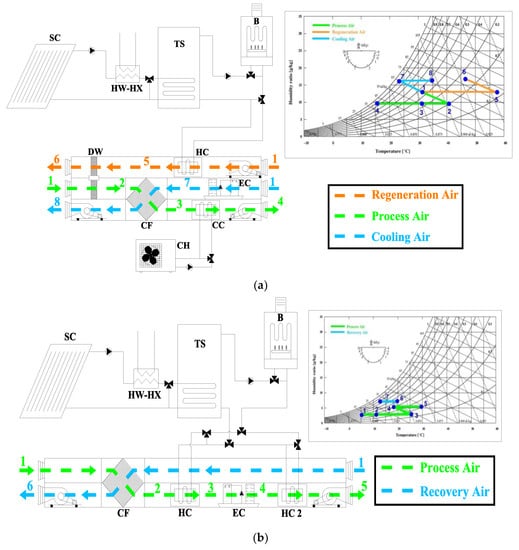 The innovative AHU is configured as that installed at the University of Sannio laboratory [28]. It is a hybrid desiccant-based air handling unit because air cooling is also controlled with an electric chiller (CH). It has three air channels: one for process air, that is the air supplied to the conditioned space after dehumidification (1–2) and cooling (2–3–4); one for the cooling air, that is outdoor air cooled down by humidification (1–7); the last one for regeneration air, that is outdoor air heated up (1–5) by solar thermal energy or if necessary by the heat supplied by a natural gas fired boiler (B) to regenerate (5–6) the hygroscopic material of the desiccant wheel. The adsorption process realized on the surface of the lower part of the desiccant wheel allows a nearly isenthalpic dehumidification process, (see Figure 1a).
