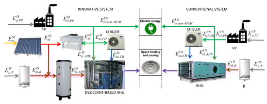 The primary energy of the innovative and conventional system () is assessed taking into account that the Italian national electric system energy efficiency (ηEG), including transmission and distribution losses, is 42% [30], and using the boiler efficiency reported before (namely 90.2%). Furthermore, it is considered that solar energy does not determine a primary energy as it is a renewable energy source.