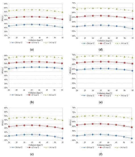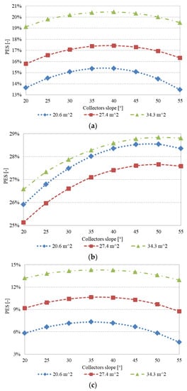 On an annual basis the comparison of the proposed innovative system and the conventional one determines the results, in terms of PES, reported in Figure 3. The best performance was reached by the MILGO DW, for which PES was close to 29%, while in the case of silica-gel the maximum PES was slightly over 20%, and with the zeolite tuff DW it was about 14% in the best layout. For all three hygroscopic materials the widest collecting surface (about 34 m2) determines the best energy results, but while with silica-gel and zeolite-rich tuff DW PES decreases when collector surface becomes smaller (Figure 3a,c), this does not happen with MILGO. The anomalous trends of Figure 3b are explained by the reduced amount of thermal energy needed to regenerate MILGO; the benefits in regeneration obtained with 27 m2 of solar collectors, instead of 20 m2, do not compensate the energy costs for dissipation; the situation changes at 34 m2. The low regeneration energy of MILGO is further proven by the optimum tilt angle, which is about 50°, because the plant energy behavior is mainly influenced by the winter energy demand, in this situation solar energy is better exploited with a high tilt angle.