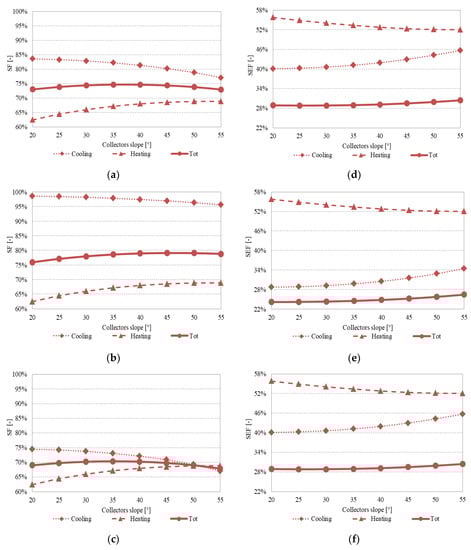 Solar fraction (left side) and solar energy factor (right side) as a function of the tilt angle in cooling operation, heating operation and total, for the plant with 34 m2 of solar collectors and the innovative AHU equipped with: (a,d) silica-gel DW, (b,e) MILGO DW and (c,f) zeolite-rich tuff DW.
