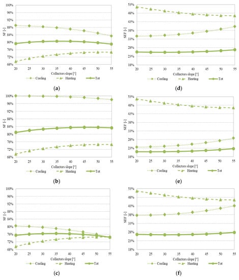 The solar energy factor for the summer period assumes lower values with respect to SEFHeating especially with MILGO DWs; in the worst case (34 m2 solar collector and 20° tilt angle) it is equal to just over 23%, demonstrating a large amount of solar energy dissipated. This consideration is, in general, always true, SEFCooling is lower than SEFHeating, by about 50% in the best case. Unfortunately, the low seasonal SEF derived from the weekend days when the air-conditioning system is not working. All year round the solar energy factor is further reduced due to the long period in the intermediate season in which the HVAC system is switched off. In addition it can be noted that SFTotal trend is quite flat and it is not affected by the tilt angle.