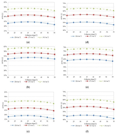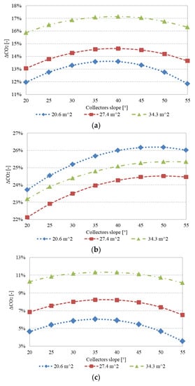 In terms of avoided equivalent CO2 emissions, the air-conditioning plants with silica-gel DW and those with zeolite-rich tuff DW have similar behaviors but the environmental performances with the conventional material are better than with tuff (Figure 7a,c). The parameter ΔCO2 increases with the solar field aperture area and in the best case is about 17% and 11% with silica-gel and zeolite-rich tuff, respectively. The optimal tilt angle is close to 40° with the standard material while it moves towards 35° with tuff. MILGO DW-based plants use large amount of solar thermal energy and are responsible for low emissions, in fact, also in worst case higher ΔCO2 are reached. As for PES, the largest solar collecting surface does not correspond with the best ΔCO2 (Figure 7b). On the contrary, the lowest emissions take place with the 20 m2 solar field because there is the minimum demand of electricity for dissipation ().