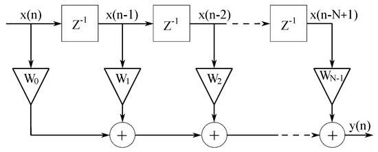 The block diagram of the adaptive filter is shown in Figure 6, where represents the coefficients of the scale vector of the transversal FIR filter and represents the delay. This block diagram is valid both for LMS and RLS algorithms. In this study, the input signal is in the form of a column vector defined by the following equation: