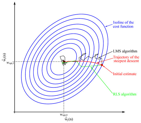 - Adaptive algorithms (least mean squares (LMS) algorithm, normalized least mean squares (NLMS), recursive least mean squares (RLS) algorithm, etc.) [46,47,48].