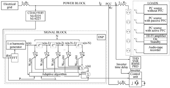 The primary objective of the authors is to develop a controlled adaptive modular inverter, which will reflect the advantages of the adaptive systems. In the SAPF control area, these are new, still unused approaches. The adaptive systems are characterized by the ability to change their parameters according to information about the controlled system or processed signal. The real-time identification (adaptive) algorithm is the core of the adaptive system. Modern adaptive systems have already succeeded in many areas and industries (e.g., biological signal processing [15,16,17,18,19]; speech signal processing [20,21,22,23,24]; control and regulation area [25,26,27,28]; etc.), and current practice suggests that the same trend will continue in the future. For the practical use of these methods in real applications, theoretical and practical research of both new and current methods is needed. The application areas of these new approaches to digital signal processing are not very developed yet and are missing in some areas. This can also be said of the area of SAPF control. For this reason, there is a wide scope for further research and development. This paper presents a pilot study in this area.