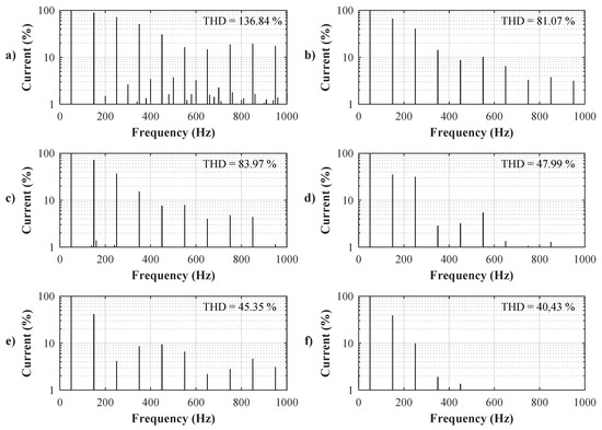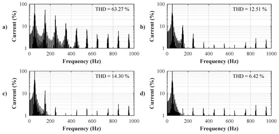 Revuelta et al. [12] analyzed the strategies gained from five formulations of the instantaneous power theory (d-q [9,10], p-q [11], modified d-q [12], p-q-r [13], and vector [12]) applied on symmetrical, asymmetrical, and non-sinusoidal symmetrical nonlinear systems. They compare the performance of the compensation using two quantities measured in the source currents after compensation: the value of THD and the effective value of the current in the neutral wire in a three-phase four-wire system. The methods p-q, p-q-r, d-q, and vector obtained a zero current through the neutral wire, but the modified p-q methods did not obtain these results.