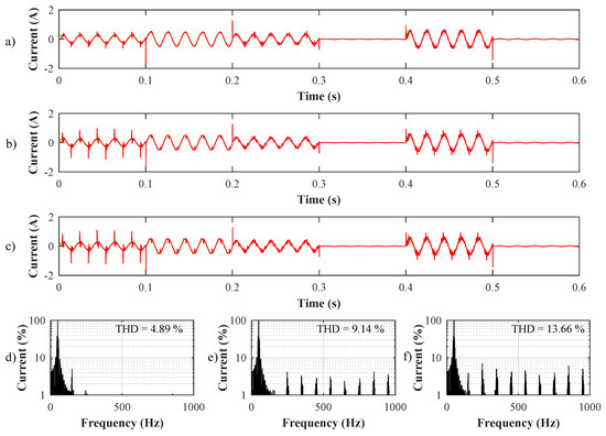 The currents and contain both AC and DC components. The primary component of the current is the fixed DC part, and the AC component represents a harmonic part. This harmonic component can be easily extracted using the high-pass filter. The current is the combination of the fundamental active current () and the harmonic current of the load (). The primary component of the current rotates synchronously with the rotating axis, and it can be considered as the direct current. By the filtering of , the current representing the fundamental component of the current of the load in the synchronous axis is gained. Thus, the AC component can be obtained by subtracting from the total current , which leaves behind the harmonic component present in the current of the load. In the rotating axis, the current of axis q () represents a sum of the fundamental reactive current and of the harmonic currents of the load. The current in axis q can be used for the calculation of the reference compensation current. The inverse transformation is made for the transformation of the currents from the two-axis synchronous axis d-q into a two-axis stationary axis - according to Equation (8) [10].