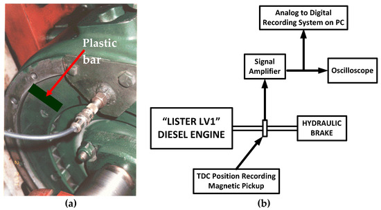 It is of particular importance to discuss the installation and the use of the magnetic pickup on the engine flywheel for recording TDC position signal. For this reason, in Figure 3a is shown the installation of the magnetic pickup on “Lister LV1” engine flywheel and in Figure 3b is shown a schematic view of the complete TDC position signal measuring and recording apparatus. As evidenced from Figure 3a, a plastic bar is placed on the flywheel following the rotation of the engine crankshaft. When the plastic bar is aligned with the magnetic pickup, then the circuit is closed and the TDC position signal becomes equal to zero. Though, during recent decades, a shaft encoder has been used for monitoring cylinder pressure, which is capable of recording pressures with very small crank angle steps, e.g., 0.1 or 0.2 of crank angle degree, the use of magnetic pickup is a cost-effective and reliable method for measuring TDC position signal and it has been used in many engine tests with conventional and alternative diesel oils [42].