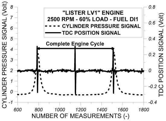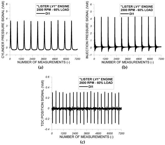 (a) Cylinder pressure signal, (b) fuel injection pressure signal, and (c) TDC position signal as obtained from the “Lister LV1” engine during testing procedure for test fuel DI1 at 2500 rpm and at 60% of full engine load.
