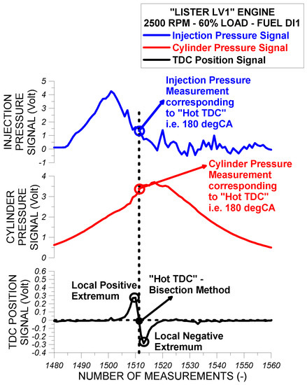 Graphical explanation of “hot TDC” position determination per engine cycle. Also, in the figure, the graphical explanation of the cylinder pressure and the injection pressure measurements tracking corresponding to the “hot TDC” is shown. Experimental data are given for “Lister LV1” engine at 2500 rpm and at 60% of full engine load using fuel DI1.