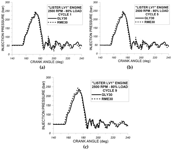 Comparison of experimental results for fuel injection pressure profile of (a) the first engine operation cycle, (b) the fifth engine operation cycle, and (c) the ninth engine operation cycle for test fuels RME30 and GLY30 at 2500 rpm and at 80% of full load. All experimental results are given for the high-speed single-cylinder DI diesel engine “Lister LV1”.
