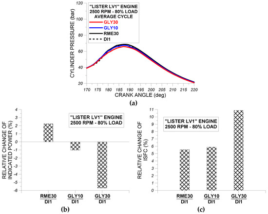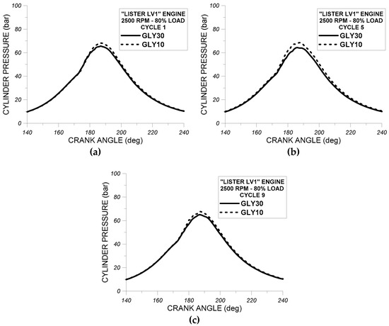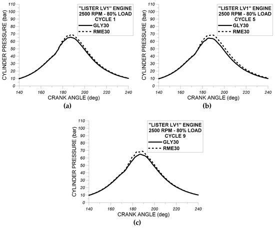 In Figure 8a–c, experimental results for cylinder pressure profiles of RME30 and GLY30 of the first (Figure 8a), the fifth (Figure 8b), and the ninth (Figure 8c) complete engine cycle at 2500 rpm and at 80% of full load of “Lister LV1” engine are shown. We also decided to assess the effect of RME30 and GLY30 on the cylinder pressure profiles of the first, the fifth, and the ninth obtained complete engine cycles to evaluate the impact of these oxygenated fuels on the cycle variation of the measured cylinder pressure.