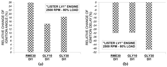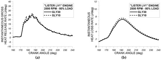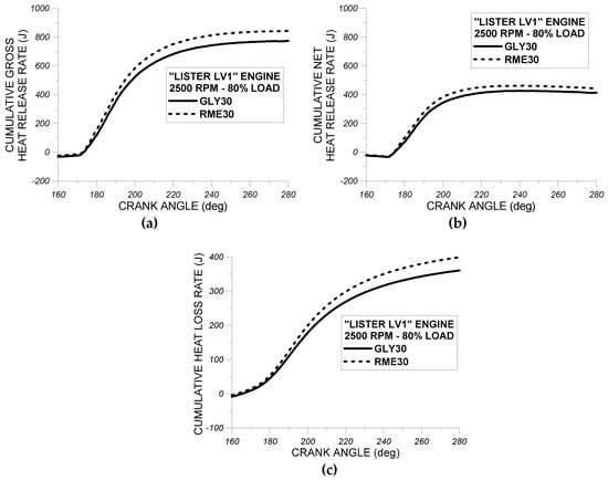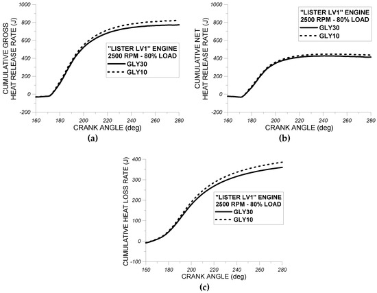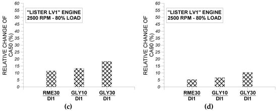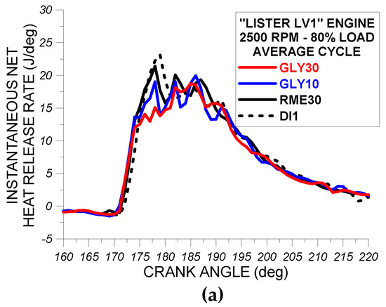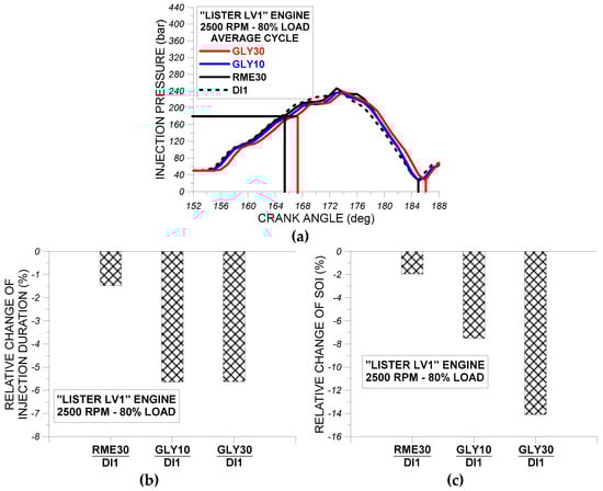 From the observation of Figure 7a–c, it is concluded that the use of fuel RME30 in “Lister LV1” engine resulted in an earlier initiation of fuel injection pressure rise and also in a steeper injection pressure rise compared to fuel GLY30. These observations can be attributed to the lower compressibility factor of RME30 compared to GLY30. Also as evidenced from Figure 7a–c, the individual impact of fuels RME30 and GLY30 on fuel injection pressure profile do not vary noticeably from one engine cycle to another, indicating that the fuel injection pressure system performs almost the same when using either RM30 or GLY30.