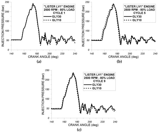 In Figure 7a–c, experimental results for fuel injection pressure profiles of RME30 and GLY30 of the first (Figure 7a), the fifth (Figure 7b), and the ninth (Figure 7c) engine recorded cycle at 2500 rpm and at 80% of full load are shown. All experimental results shown in Figure 7a–c are given for the high-speed single-cylinder DI diesel engine “Lister LV1”. It was decided that the effect of RME30 and GLY30 on the fuel injection pressure profiles of the first, the fifth, and the ninth recorded complete engine cycle would be examined to assess the impact of these oxygenated fuels on the cycle variation of the fuel line pressure, since the physical properties of these fuels may influence the behavior of the fuel injection system.