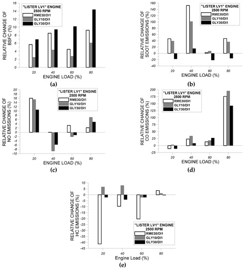 Figure 20d demonstrates the variation of the percentage change of measured CO emissions (in ppm) of the three oxygenated fuels RME30, GLY10, and GLY30 with reference to baseline fuel DI1 as function of engine load at 2500 rpm. As observed from Figure 20d, with the exception of 20% load, the transition from “base” fuel DI1 to oxygenated fuels RME30, GLY10, and GLY30 at all engine loads resulted in a considerable deterioration of CO emissions compared to baseline diesel operation. The more characteristic relative deterioration of tailpipe CO values is evidenced at 80% of full load, where the relative increase of CO emissions ranges from 143% for GLY30 to 196% for GLY10 compared to “base” fuel DI1. The substantial worsening of CO emissions when burning oxygenated fuels at high engine load (i.e., 80%) can be ascribed to the increase of fuel consumption in the case of oxygenated fuels due to LHV reduction for sustaining constant engine load, which lead to the increase of fuel/air equivalence ratio and to the substantial promotion of CO emissions.