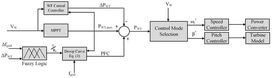 Figure 2 demonstrates the implementation of fuzzy-logic with the dynamic droop controller. Normally, the wind speed, , can be measured to estimate the maximum power of the turbine, . The maximum power is decreased by to maintain a certain reserve. Every individual WES is de-loaded to maintain a certain reserve of power () to be utilized to provide APC during a drop in the grid’s frequency. When grid’s frequency drops below its set point, the controller injects a certain amount of active power into the grid. Then, this power, PFC, is added to the loop to produced power to form a reference of the required total wind power. The reference point, , of the total power is then achieved either by using a pitch angle or rotor speed controller.