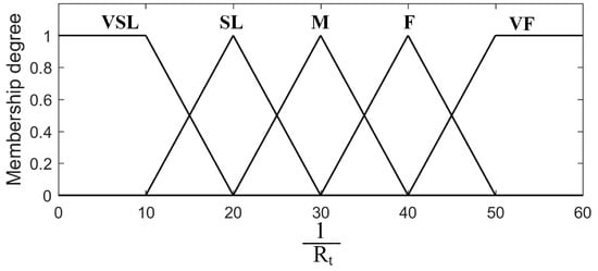 The crisp values of the two inputs are mapped into fuzzy sets using the triangle membership function. Both inputs are defined using five fuzzy sets as shown in Figure 3 and Figure 4. The sets of the inputs are defined as: very large (VL), large (L), medium (m), small (S), and very small (VS).