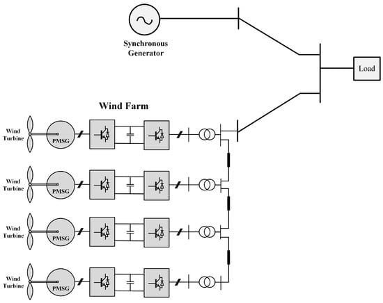 To study the performance of the proposed controller, the small power system is considered as shown in Figure 6. The model of the wind turbine considered in this paper is defined as type-4, where the WT is connected to the grid through a full rated back-to-back converter. The machine used in this system is based on a permanent magnet synchronous generator (PMSG). The machine side converter is controlled to extract the desired power from the wind. The active and reactive power is controlled using the grid-side inverter. The detailed model of the implemented WT system and its designed controller are presented in reference [51].