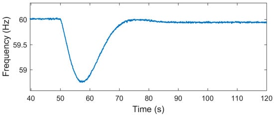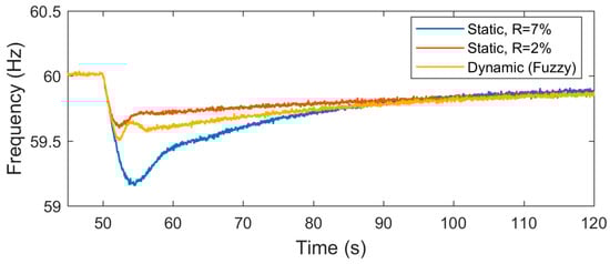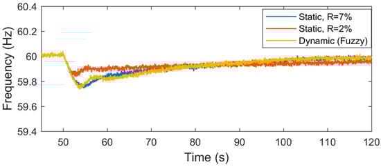 For this case study, the WES was producing its maximum power (2.0 MW). The power reserve of the WES was set to 1.0 MW (i.e., a 50% rate). First, the frequency regulation was achieved using the proposed fuzzy-logic controller. Then, the simulation was repeated using two different static droop rates (). Figure 7 demonstrates the system frequency of the baseline simulation (without WES participation in frequency regulation). Figure 8 shows the frequency of the grid for the three simulation studies (fuzzy logic, , ). The proposed fuzzy logic-based controller provides an acceptable frequency support if compared to both static droop curves.
