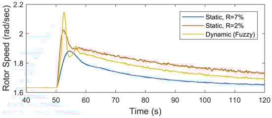 In this simulation, the response of the WES using constant droop of is reasonable. In contrast, the response with a constant curve of is quick. As can be noticed from Figure 14, the rotor speed of the WES oscillates aggressively. This high oscillation may lead to instability in the controller of the machine side converter. Also, some stresses and mechanical loading can be observed on the wind turbine. Because of the limited reserve and insignificant drop in the frequency, the droop rate of the controller has to be slow. Thus, the grid frequency can be achieved by the proposed droop controller, which in this case study is very close to the response of seven percent droop curve. The active power produced by the WES during the frequency regulation for all three studies is demonstrated in Figure 15.
